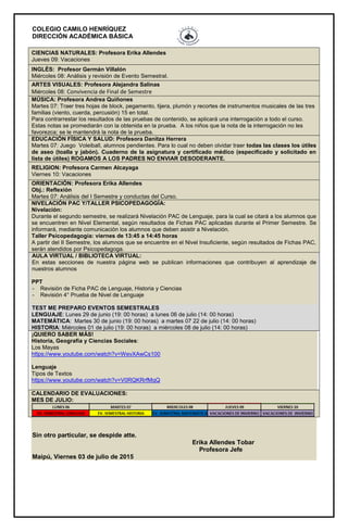 El resumen proporciona información sobre los requerimientos y eventos de la próxima semana para los estudiantes de cuarto año básico en el Colegio Camilo Henríquez. Se informa a los apoderados que los estudiantes deben traer diariamente el libro "El Tesoro de los Reyes de Irlanda" y que habrá pruebas y eventos semestrales en varias asignaturas. También se indica que las vacaciones de invierno serán del 9 al 24 de julio.