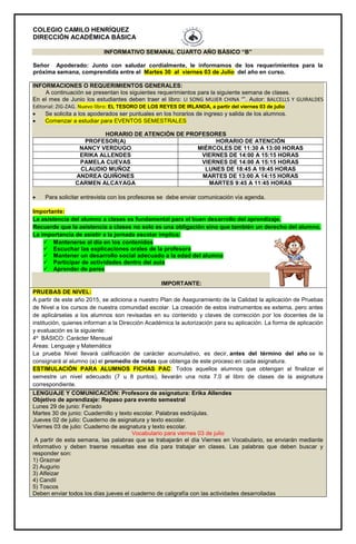 El resumen proporciona los requerimientos escolares para la próxima semana para los estudiantes de cuarto año básico "B" en el Colegio Camilo Henríquez, incluyendo los libros que deben traer, las asignaturas que se enseñarán cada día con sus objetivos respectivos, y los horarios de atención de los profesores. También indica que comenzarán las pruebas de nivel mensuales en lenguaje y matemática y da detalles sobre talleres de apoyo y nivelación.