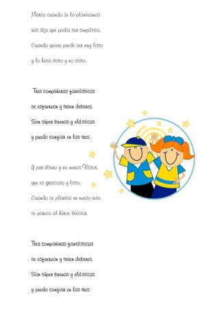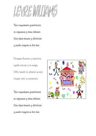 El documento presenta descripciones de varios niños que forman parte de diferentes grupos y mesas en una clase. Se describen sus personalidades, cualidades y actividades favoritas.