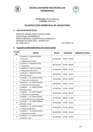 Este documento presenta la planificación semestral de la asignatura de Informática para el cuarto nivel/paralelo 3 de la carrera de Medicina en la Escuela Superior Politécnica de Chimborazo. La planificación incluye 55 clases que abarcan 6 unidades temáticas desde octubre 2016 hasta marzo 2017. Las unidades temáticas son: Presentación, El computador, Web 2.0, Trabajo colaborativo, MS Office Word 2010 y MS Office Excel 2010. La asignatura tiene una carga de 5 créditos (93 horas) y contará con