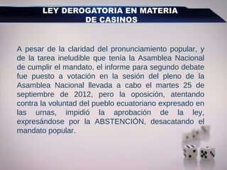 El documento describe cómo la oposición en la Asamblea Nacional del Ecuador se abstuvo de votar y así impidió la aprobación de una ley derogatoria de casinos, desacatando el mandato popular expresado en las urnas. Menciona a algunos asambleístas específicos que se burlaron y desacataron el mandato popular al abstenerse de votar para aprobar la ley.