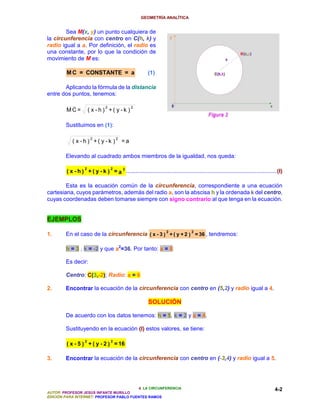 El documento describe la ecuación de la circunferencia. Explica que la circunferencia es el lugar geométrico de todos los puntos equidistantes de un punto central llamado centro. Deriva la ecuación común de la circunferencia en términos del centro (h, k) y el radio a. Luego generaliza esta ecuación y analiza algunas propiedades de la ecuación general de la circunferencia. Finalmente, presenta ejercicios para encontrar el centro y radio a partir de la ecuación dada.