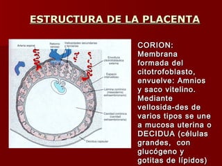 Este documento describe la estructura y función de la placenta y membranas embriofetales. La placenta está formada por el corion y la decidua, que permiten el intercambio de nutrientes y gases entre la madre y el feto a través de vellosidades. El amnios contiene líquido amniótico que protege y permite el movimiento del feto.