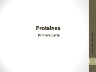 Este documento presenta una introducción a las proteínas. Explica que las proteínas son polímeros formados por la unión de 20 aminoácidos diferentes. Detalla las estructuras primarias, secundarias, terciarias y cuaternarias de las proteínas, y cómo estas estructuras determinan su función. Finalmente, clasifica las proteínas en globulares, fibrosas y otras categorías, dando ejemplos de cada tipo.