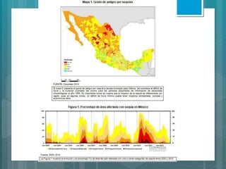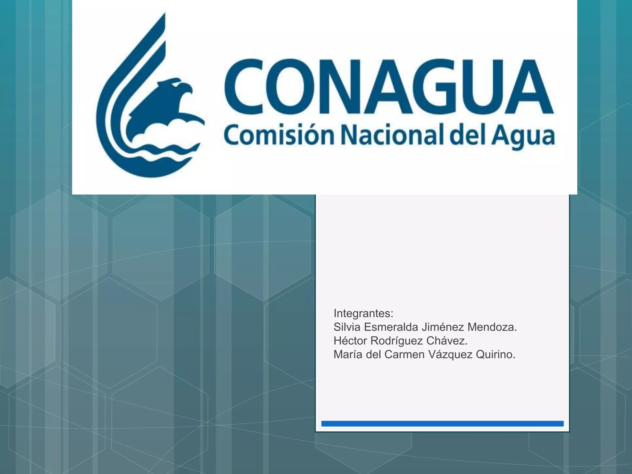 El documento presenta información sobre la Comisión Nacional del Agua (CONAGUA) y sus funciones de administrar y preservar las aguas nacionales de México. También describe los servicios meteorológicos nacionales (SMN) que brindan pronósticos del tiempo e imágenes satelitales, así como los trámites electrónicos relacionados con concesiones de agua que se pueden realizar. Además, presenta información sobre el Registro Público de Derechos de Agua y las oficinas de atención de CONAGUA organiz