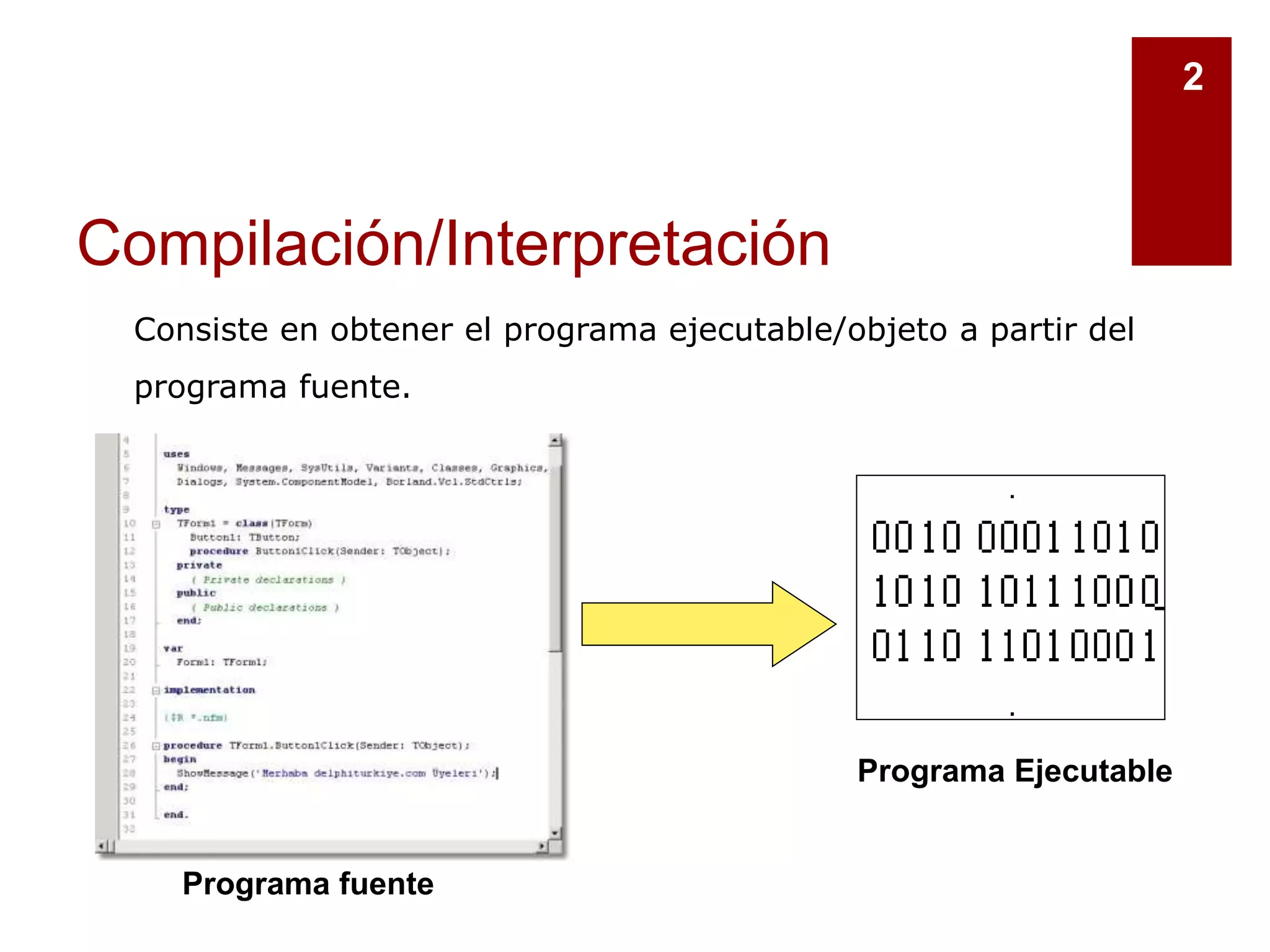 Este documento explica conceptos básicos sobre algoritmos y lenguajes de programación. Describe los procesos de compilación e interpretación para obtener un programa ejecutable a partir de código fuente. También define lenguajes de máquina, ensamblador y de alto nivel, e incluye ejemplos de código en cada uno. Finalmente, resume las etapas típicas de la programación, incluyendo la modificación del código fuente, compilación, enlace, pruebas y aplicación.