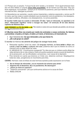 El documento resume cuatro cosas que no debemos perder según Hebreos 10:35-39: 1) No perder la confianza en Dios, 2) No perder la paciencia, especialmente durante tiempos de aflicción, 3) No perder la esperanza en el pronto regreso de Cristo, y 4) No perder la fe en Dios retrocediendo espiritualmente. Exhorta a los creyentes a mantenerse firmes en su fe a pesar de las dificultades.