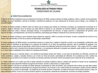 El documento describe el sistema de créditos académicos del SENA para sus programas de formación. Un crédito equivale a 48 horas de trabajo de aprendizaje. Los programas tienen una etapa lectiva y una etapa práctica. Los créditos se asignan a cada competencia técnica y a la competencia transversal teniendo en cuenta las horas dedicadas al trabajo directo, práctico e independiente. El programa en Tecnología en Actividad Física tiene 73 créditos para competencias técnicas, 7 créditos para la competencia transversal y 10 cré