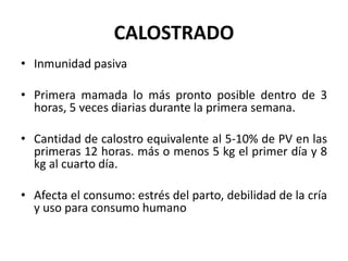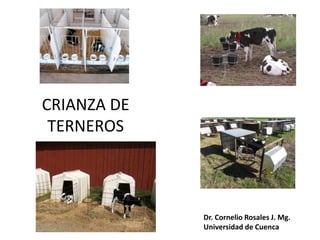 Este documento describe los sistemas y prácticas de crianza de terneros. Explica que la crianza natural con la madre es menos favorable que los métodos artificiales debido a factores como la alimentación insuficiente y alta mortalidad. Describe las etapas de la crianza artificial, incluido el importante proceso de calostrado en las primeras horas para transferir inmunidad, y las dietas, prácticas y destete en cada etapa hasta alcanzar un peso final de 140-160 kg a los 180 días.