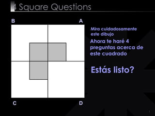 El documento presenta 4 cuadrados (A, B, C, D) y hace 4 preguntas sobre cómo dividir el área blanca de cada cuadrado en un número específico de piezas iguales. Se guía al lector a través de cada pregunta proporcionando pistas, soluciones y comentarios para enfatizar que nuestras mentes pueden ser condicionadas.