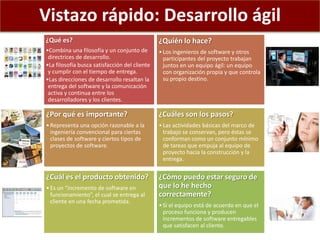 El desarrollo ágil es una filosofía que prioriza la satisfacción del cliente y la entrega rápida de software, fomentando la colaboración activa entre desarrolladores y clientes. Implica un trabajo en equipo autoorganizado y adaptable, lo que permite respuestas rápidas a los cambios y un enfoque en la entrega de incrementos de software funcionales. Existen varios modelos de proceso ágil, como la programación extrema y el desarrollo adaptativo, cada uno con características y enfoques para facilitar la ejecución eficiente de proyectos de software.