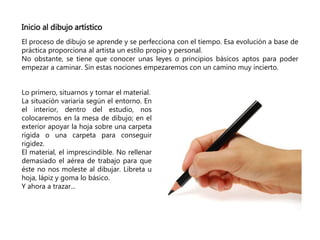 Este documento ofrece instrucciones para comenzar a dibujar artísticamente. Explica que se debe conocer los principios básicos antes de empezar y recomienda situarse con el material adecuado como lápiz y papel. Además, enfatiza la importancia de modificar la actitud para simplemente trazar formas imitando lo que se ve en lugar de juzgar los dibujos. Finalmente, propone un ejercicio de visualización y trazo tomando un objeto y dibujándolo por trozos mientras se mira alternadamente el obj