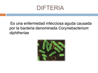 La difteria es una enfermedad infecciosa aguda causada por la bacteria Corynebacterium diphtheriae. Provoca la formación de membranas que pueden obstruir la garganta o las vías respiratorias y cuya toxina puede dañar órganos a distancia. Los síntomas incluyen fiebre, dolor de garganta y dificultad para respirar. El tratamiento consiste en antitoxina y antibióticos, y se previene mediante la vacunación.