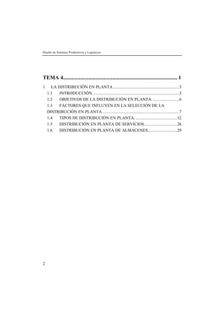 Este documento habla sobre la distribución en planta y sus objetivos. Explica que la distribución en planta implica decidir cómo disponer los centros de actividad económica como personas, máquinas y departamentos dentro de una instalación. Sus objetivos incluyen mejorar la eficiencia, reducir congestión, mejorar supervisión, facilitar cambios y aumentar productividad y moral de los empleados. También discute factores que influyen en la selección del tipo de distribución y diferentes tipos como la distribución en línea y en grupo.