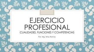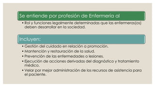 Este documento describe las cualidades, funciones y competencias de la profesión de enfermería. Define el rol de enfermería como la gestión del cuidado de la salud, prevención de enfermedades, y apoyo al tratamiento médico. Explora los roles asistenciales, administrativos, educativos e investigativos de los profesionales de enfermería y sus especialidades. También presenta ejemplos exitosos de enfermeras en posiciones de liderazgo.