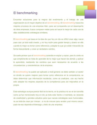 El benchmarking busca identificar los mejores procesos de empresas líderes para comparar el desempeño de una organización y establecer estrategias similares con el objetivo de mejorar el rendimiento. Se basa en la idea de aprender de lo que ya existe e innovar de manera trascendente, no simplemente copiar, sino adaptar lo aprendido a cada empresa. El benchmarking requiere enfocarse en un sector específico, determinar la información a recolectar, analizarla y adaptar los mejores aspectos de la competencia para mejorar.