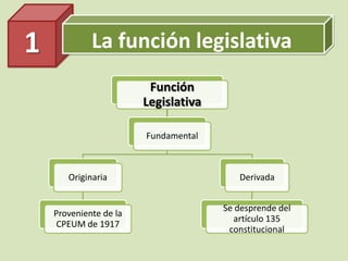 El documento describe el Congreso de la Unión de México, incluyendo su función legislativa, su estructura con dos cámaras, los requisitos para ser congresista, la forma de elección, la independencia e inmunidad de los congresistas, los periodos de sesiones y tipos de sesiones, el quórum necesario, y el proceso legislativo con las etapas de iniciativa, discusión, aprobación, promulgación y vigencia.