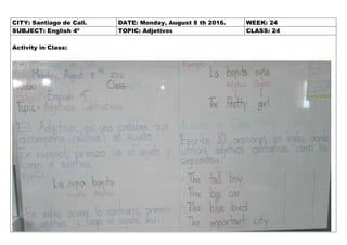 Los tres documentos describen las lecciones de inglés de la 4ta semana en agosto de 2016 y 2017. Las lecciones incluyen temas como adjetivos, números del 1 al 100, días de la semana, expresar la hora y rutinas diarias. Los estudiantes deben responder preguntas sobre cómo planifican su tiempo y describen su vida diaria. También deben completar ejercicios sobre adjetivos y números cardinales y ordinales en inglés.