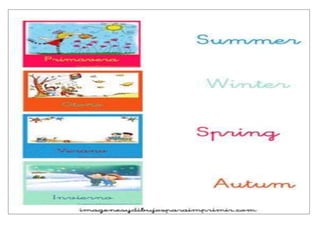 El primer documento resume una clase sobre las estaciones del año en inglés, incluyendo las fechas de inicio y finalización. Los estudiantes deben dibujar y nombrar cada estación en inglés como tarea. El segundo documento cubre una lección sobre prendas de vestir, colores y formas, donde los estudiantes dibujan y describen su ropa favorita en inglés.