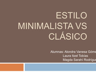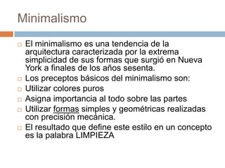 El documento compara el estilo minimalista y el estilo clásico en la decoración. El minimalismo se caracteriza por la simplicidad, el uso de colores neutros y formas geométricas, mientras que el estilo clásico se caracteriza por estar recargado de elementos decorativos como cuadros y muebles antiguos. Aunque diferentes en su uso de elementos decorativos, ambos estilos pueden crear espacios elegantes pero de forma distinta.