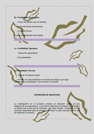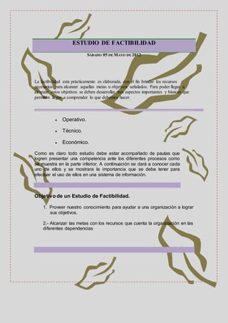 El documento aborda la elaboración de un estudio de factibilidad con el fin de proporcionar recursos necesarios para alcanzar los objetivos de una organización. Detalla tres aspectos fundamentales: operativo, técnico y económico, que son esenciales para el éxito del proyecto. Además, enfatiza la importancia de evaluar los recursos y costos involucrados para optimizar procesos y cumplir con las metas establecidas.