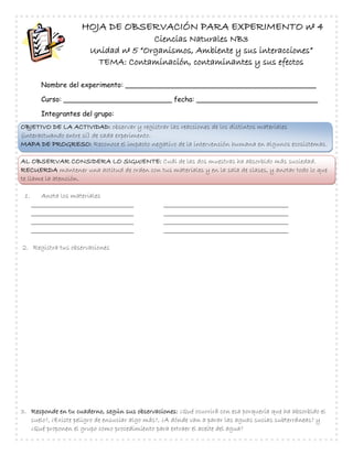 El documento es una hoja de observación para un experimento sobre contaminación y sus efectos en los ecosistemas. Se enfoca en observar y registrar las interacciones de materiales y las reacciones ante la contaminación, así como el impacto negativo de la intervención humana. Los estudiantes deben anotar sus materiales, observaciones y reflexionar sobre las implicaciones de la contaminación en el medio ambiente.