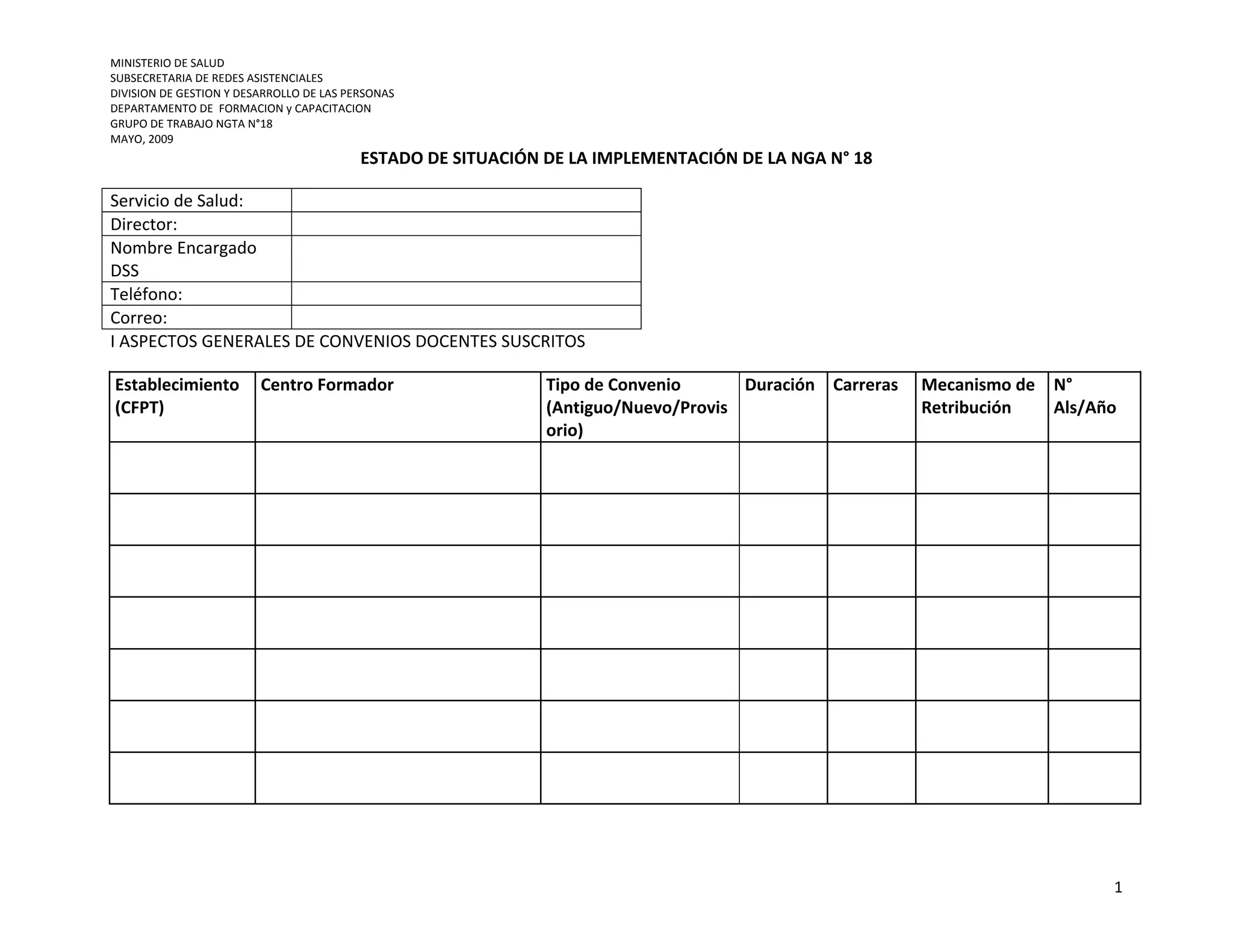 Este documento presenta el estado de implementación de la Norma General Administrativa N°18 en un servicio de salud. Reporta detalles sobre los convenios docentes suscritos con centros formadores, incluyendo el tipo de convenio, duración y número de alumnos por año. También describe aspectos relativos a la implementación a nivel del servicio de salud y de los centros asistenciales, como la designación de contrapartes técnico-administrativas y la existencia de comités docentes y normativas internas. Finalmente, menciona que se deben