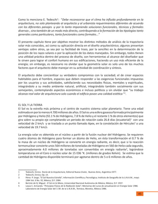 Este documento describe la importancia de la geometría solar en el diseño arquitectónico. Explica que desde tiempos antiguos, el hombre ha utilizado su conocimiento de la trayectoria solar para medir el tiempo y aprovechar la energía solar. También describe los principales movimientos de la Tierra y cómo esto afecta la incidencia de la radiación solar. El objetivo del capítulo es mostrar diferentes métodos de análisis de la trayectoria solar y su aplicación en el diseño para lograr el confort humano a través de la orientación, ubicación de espac