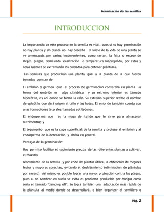 Este documento describe el proceso de germinación de las semillas. Explica que la germinación es vital para que las plantas se desarrollen y haya cosechas. Detalla las partes de la semilla como el embrión, endosperma y tegumento, y las fases de la germinación como la absorción de agua, respiración y división celular. Finalmente, presenta resultados de experimentos sobre la germinación de semillas de soya y discute factores como la temperatura, humedad y oxígeno necesarios para que ocurra con éx