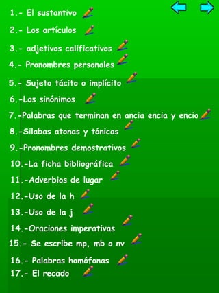 Este documento presenta una lista de 51 temas relacionados con gramática, matemáticas, ciencias naturales, historia y civismo de México. Los temas incluyen sustantivos, artículos, adjetivos calificativos, pronombres personales, sujeto tácito, sinónimos, terminaciones en -ancia, -encia y -encio, silabas átonas y tónicas, pronombres demostrativos, y más. El documento proporciona definiciones breves de cada tema y ejercicios de práctica.