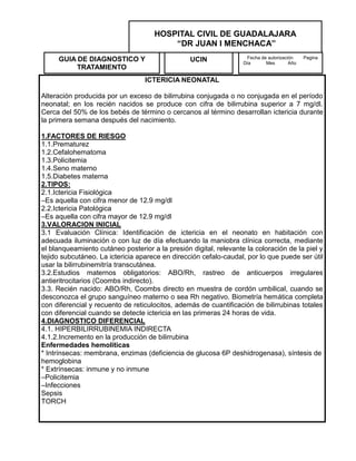 Este documento presenta una guía de diagnóstico y tratamiento de la ictericia neonatal. Describe los tipos de ictericia, factores de riesgo, evaluación inicial, diagnóstico diferencial, estudios de diagnóstico, procedimientos, terapia farmacológica, algoritmos de tratamiento, tiempo de estancia, requisitos para el alta y seguimiento en el hogar para recién nacidos con ictericia. El documento provee información detallada sobre el manejo clínico de la ictericia neonatal.