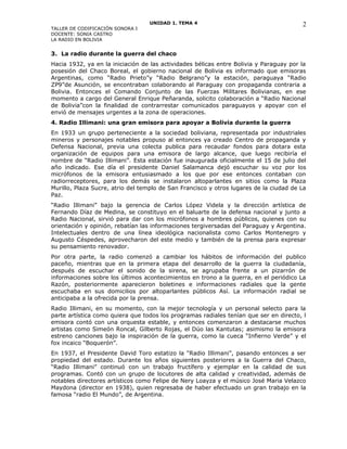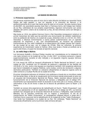 Este documento resume la historia de la radio en Bolivia. Comenzó en la década de 1890 con experimentos de transmisión realizados por sacerdotes jesuitas. La primera estación de radio en Bolivia fue inaugurada en 1929 en La Paz bajo el nombre de Radio Nacional de Bolivia. Durante la guerra del Chaco en la década de 1930, se creó Radio Illimani para apoyar el esfuerzo bélico boliviano. En las décadas siguientes, la radio se expandió rápidamente en Bolivia con la aparición de numerosas em