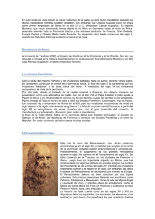 La historia de Italia comienza hace unos 3.000 años con la llegada de pueblos indoeuropeos a la península itálica. En el siglo VIII a.C., colonias griegas se establecieron en el sur, dando origen a la Magna Grecia. En el 753 a.C. se fundó Roma, que eventualmente conquistó toda la península y se expandió por el Mediterráneo. Roma pasó de ser una monarquía a una república y luego un imperio que dominó gran parte de Europa y el norte de