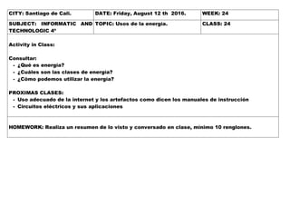 El documento resume las actividades de dos clases sobre Excel y energía. En la primera clase, los estudiantes aprendieron a usar fórmulas como =SUMA en Excel y practicaron hacer hojas de cálculo. La tarea fue practicar lo visto en una hoja a mano. En la segunda clase, consultaron sobre energía, sus tipos y usos. La tarea fue resumir la clase en 10 líneas. Las próximas clases cubrirán el uso de internet, artefactos y circuitos eléctricos.