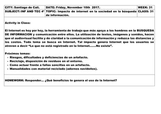 Este documento contiene tres resúmenes de clases sobre temas de tecnología e informática de cuarto grado. La primera clase cubrió el servicio de internet y correo electrónico, la segunda trató sobre el impacto de internet en la búsqueda de información, y la tercera fue sobre reciclaje y disposición de residuos.