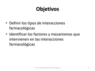 Este documento presenta un resumen de un curso sobre interacciones farmacológicas para fisioterapeutas. Explica los objetivos del curso, que son definir los tipos de interacciones farmacológicas e identificar los factores y mecanismos que intervienen. Además, describe las diferentes clasificaciones de las interacciones y los tipos de interacciones, incluyendo interacciones fisicoquímicas, farmacodinámicas y farmacocinéticas.
