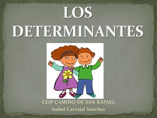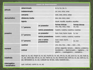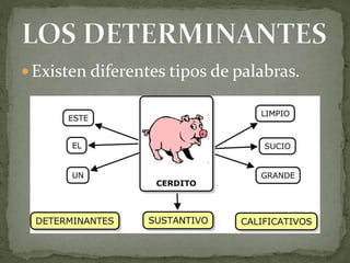El documento habla sobre los diferentes tipos de palabras, específicamente sobre los sustantivos, adjetivos y determinantes. Explica que los determinantes son palabras que acompañan a los nombres y dan información sobre ellos, como el artículo, y que concuerdan con el nombre en género y número. Además, menciona los principales tipos de determinantes como los artículos y los adjetivos determinativos. Finalmente, pide identificar los determinantes en dos oraciones de ejemplo.