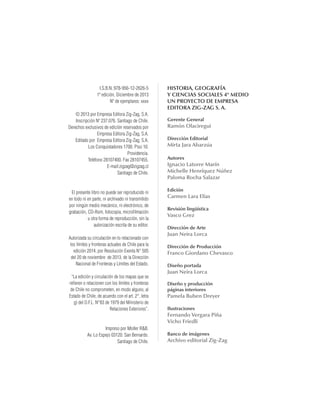 Este documento presenta la portada y los créditos del libro de texto "Historia, Geografía y Ciencias Sociales 4° Medio", publicado por la editorial Zig-Zag. El libro fue escrito por Ignacio Latorre, Michelle Henríquez y Paloma Rocha, e incluye información sobre el régimen político y constitucional chileno, la ciudadanía y las responsabilidades ciudadanas, la globalización y la inserción de Chile en el mundo, y el mercado laboral y la legislación laboral. El documento lista al equipo editorial responsable de la public