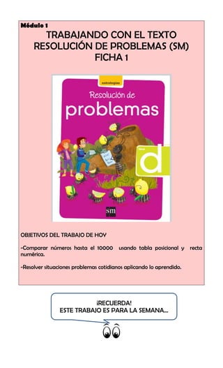 Este documento presenta una guía de matemáticas para 4° básico. Incluye instrucciones para actividades sobre comparación de números hasta 10000 usando tabla posicional y recta numérica, y resolución de problemas cotidianos. También proporciona enlaces a sitios educativos sobre ordenar y comparar números y la recta numérica.