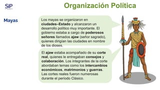 El documento analiza la organización social de las civilizaciones mesoamericanas, centrándose en los roles de los mayas y aztecas en diferentes contextos como la guerra, el comercio y la religión. Se discute la importancia de figuras como el ajaw y el papel de los sacerdotes, así como las actividades cotidianas de comerciantes, guerreros y agricultores. Además, explora el legado cultural mesoamericano, incluyendo aspectos gastronómicos como el origen de la palabra 'taco' y la relación de los mayas con el chocolate.