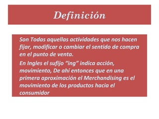 El documento define el merchandising como las actividades que influyen en la decisión de compra del consumidor en el punto de venta. Explica que el objetivo del merchandising es lograr que el consumidor demande el producto que la empresa desea vender mediante factores como la notoriedad, identificación e información del producto. También describe varios factores fisiológicos y características físicas del negocio que afectan el comportamiento del consumidor y aceleran las ventas.