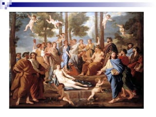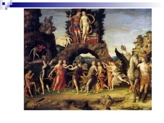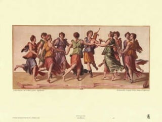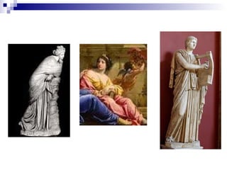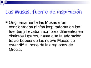 El documento describe el origen y atributos de las nueve Musas de la mitología griega. Eran diosas de la inspiración artística e intelectual hijas de Zeus y Mnemósine. Vivían en los montes Parnaso y Helicón y cada una presidía un arte o ciencia diferente (poesía, música, danza, etc.). Los artistas y pensadores las invocaban al inicio de sus obras para pedir su inspiración.