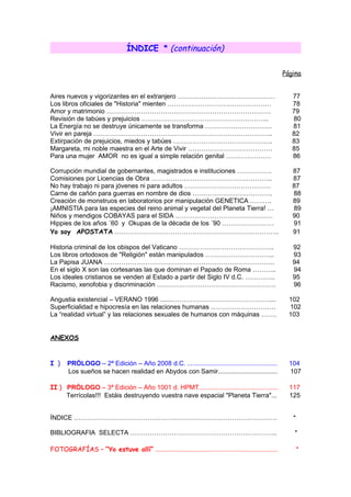 Este documento presenta el índice de un libro autobiográfico. El libro está dividido en varias partes que describen la infancia de la autora en un pueblo español, su educación, sus experiencias de juventud y su evolución personal y crisis de fe. El índice también incluye prólogos adicionales que sugieren que el libro ha sido actualizado y reeditado en el futuro.