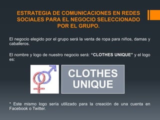 El documento describe la estrategia de comunicaciones en redes sociales para la venta de ropa de un negocio llamado "CLOTHES UNIQUE". Se utilizarán Facebook, Twitter y encuestas para dar a conocer los productos, ofrecer promociones, medir la satisfacción de los clientes, y aumentar la participación de los seguidores. El objetivo principal es vender más a través de una marca fuerte y generar recomendaciones entre amigos en las redes.