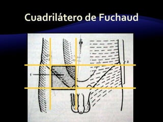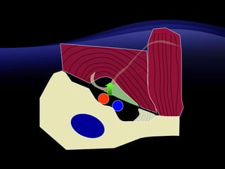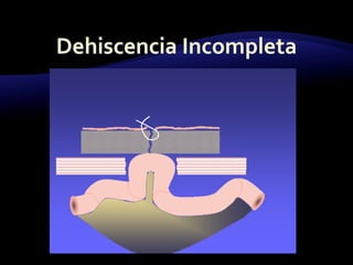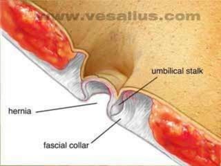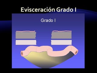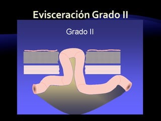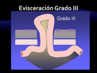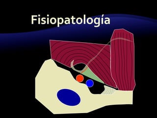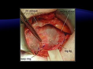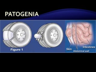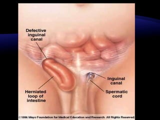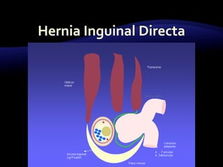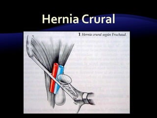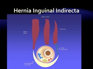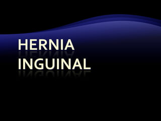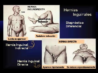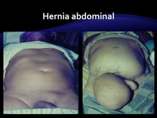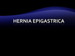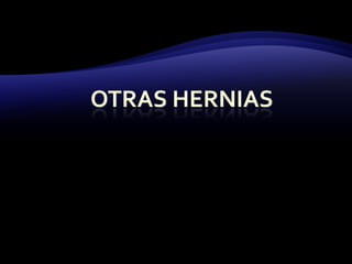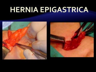 El documento resume las características y tratamiento de diferentes tipos de hernias. En 3 oraciones: Las hernias se producen cuando los órganos abdominales salen a través de defectos en la pared abdominal. Existen diferentes tipos de hernias como inguinales, umbilicales y epigástricas, cada una con sus propias características. Todas las hernias requieren tratamiento quirúrgico para reparar el defecto y devolver los órganos a la cavidad abdominal.