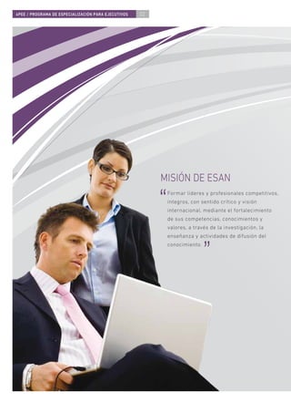 Este documento presenta el Programa de Especialización para Ejecutivos (PEE) de ESAN. El PEE ofrece más de 300 cursos en diversas áreas funcionales para que los ejecutivos puedan especializarse y mantenerse actualizados. Los participantes pueden cursar los cursos de forma flexible y recibir certificados de especialización al completar 7 cursos en un área. El programa busca desarrollar las competencias gerenciales de los ejecutivos a través de una metodología rigurosa y aplicable a la práctica laboral.