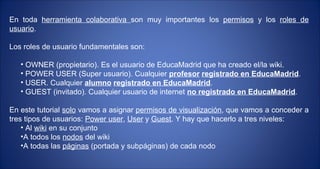 Este documento describe cómo configurar los permisos de usuario en una herramienta colaborativa. Explica los roles de usuario básicos y cómo asignar permisos de visualización a usuarios invitados, superusuarios y usuarios registrados a tres niveles: el wiki completo, cada nodo individual y todas las páginas dentro de cada nodo.