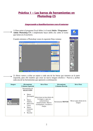 Este documento proporciona instrucciones para familiarizarse con las barras de herramientas y funciones básicas de Photoshop CS, como trabajar con capas, capturar pantallas, y crear imágenes con degradados y texto. Explica cada una de las barras de herramientas en Photoshop y cómo usar las diferentes herramientas. También muestra cómo abrir y guardar imágenes, redimensionar, copiar y pegar capas, y eliminar capas. Por último, proporciona pasos para capturar una pantalla y crear una imagen con