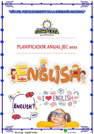 1) El documento presenta el planificador anual de inglés para el cuarto grado de una institución educativa en el Perú. 2) El plan busca desarrollar las competencias de lectura, escritura y comunicación oral en inglés mediante un enfoque comunicativo. 3) El plan incluye compromisos, objetivos, indicadores y fuentes de información para evaluar el progreso de los estudiantes en inglés a lo largo del año.