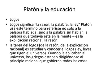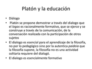 Platón creía que la educación (paideia) debía enfocarse en desarrollar la razón (logos) a través del diálogo. El diálogo es fundamental para el aprendizaje de la filosofía, ya que requiere la participación de otros sujetos. La paideia formaba a la élite intelectual en materias como la gimnasia, gramática y filosofía para gobernar el estado. Platón proponía que los jóvenes con capacidad estudiaran dialéctica durante cinco años para ejercer cargos de gobierno